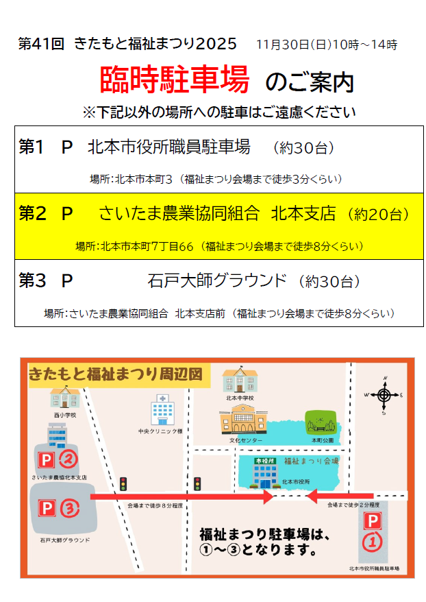 ※北本市文化センター駐車場、北本市役所駐車場には駐車できませんのでご了承ください。